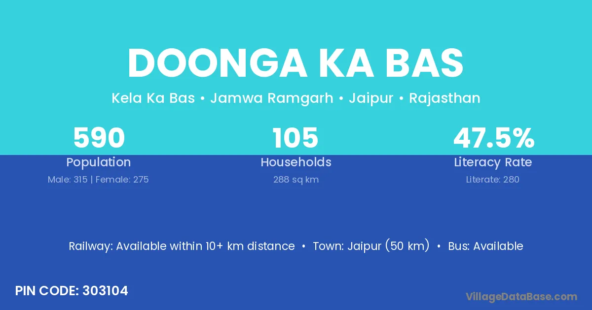 Jaipur (50 km) is the nearest town to Doonga Ka Bas village for major economic activities and is located approximately 50 km away.
