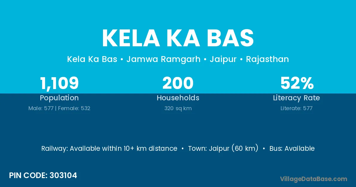 Jaipur (60 km) is the nearest town to Kela Ka Bas village for major economic activities and is located approximately 60 km away.