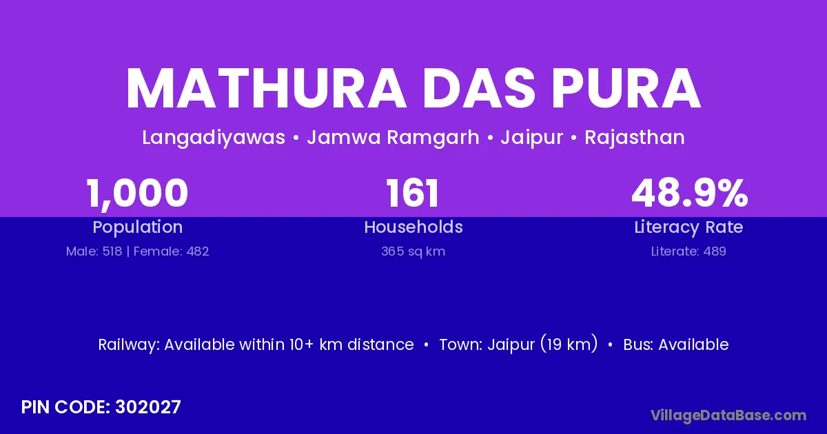 Mathura Das Pura village has a total population of 1,000 people, of which 518 are males and 482 are females.