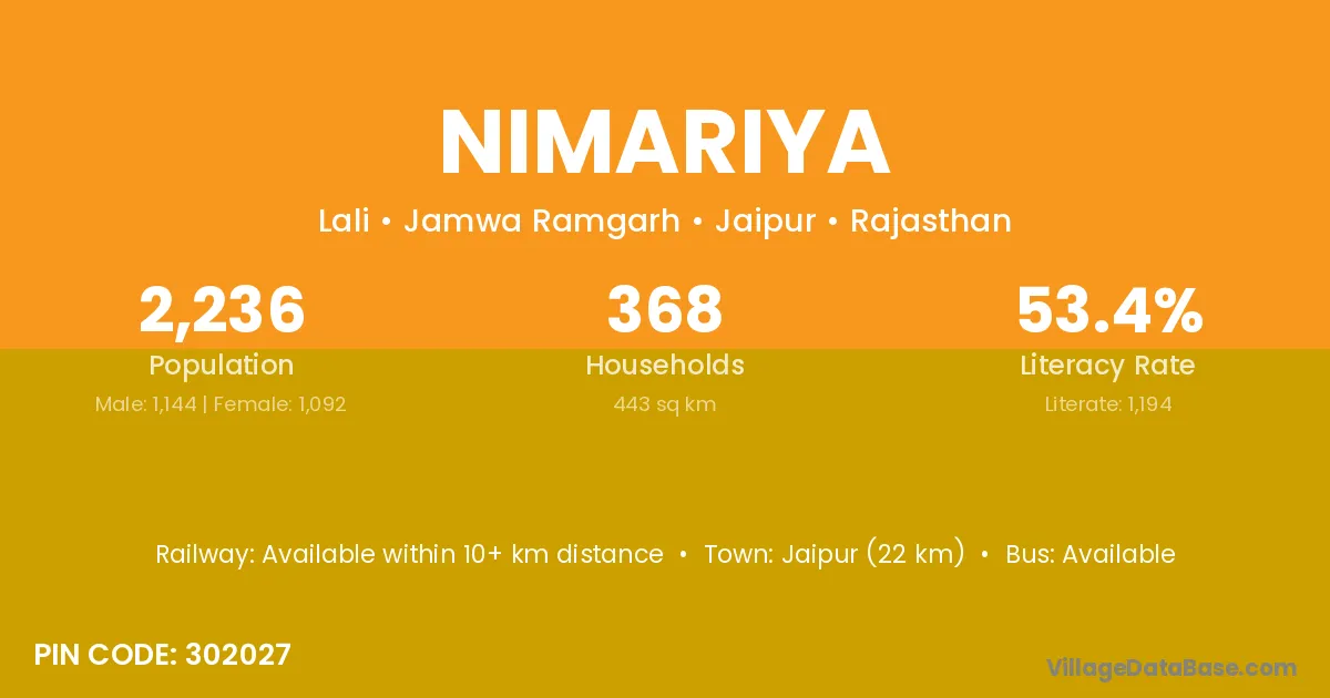 Jaipur (22 km) is the nearest town to Nimariya village for major economic activities and is located approximately 22 km away.