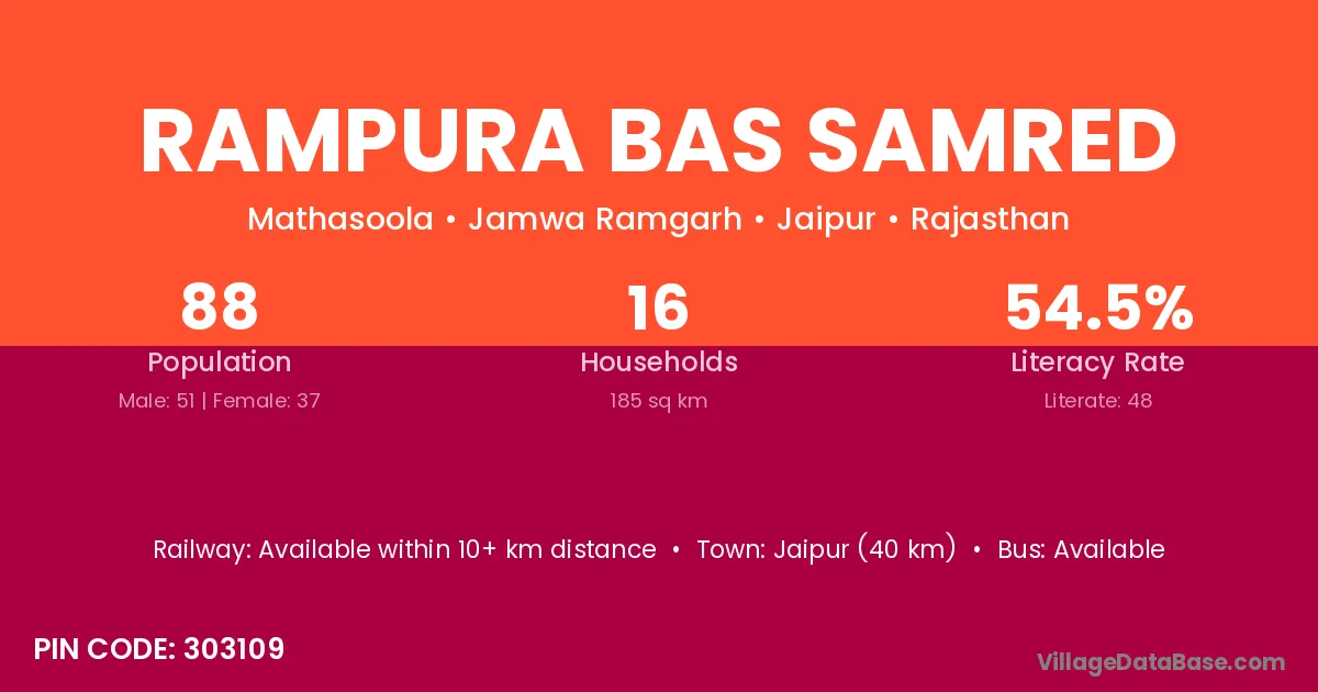 Rampura Bas Samred village has a total population of 88 people, of which 51 are males and 37 are females.