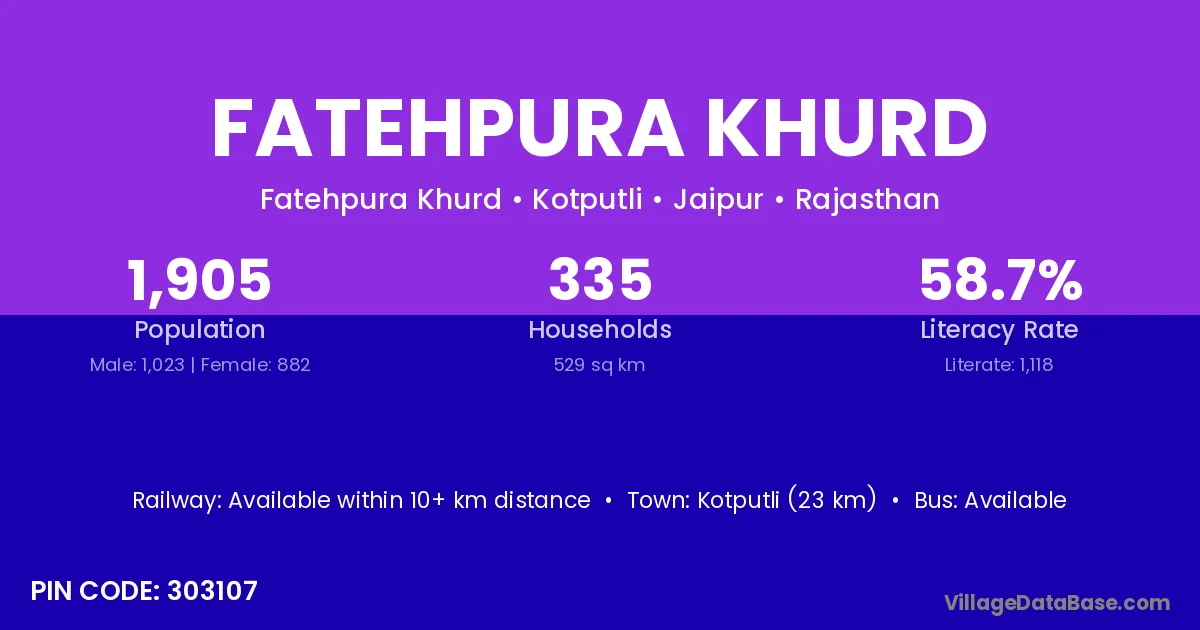 Kotputli (23 km) is the nearest town to Fatehpura Khurd village for major economic activities and is located approximately 23 km away.