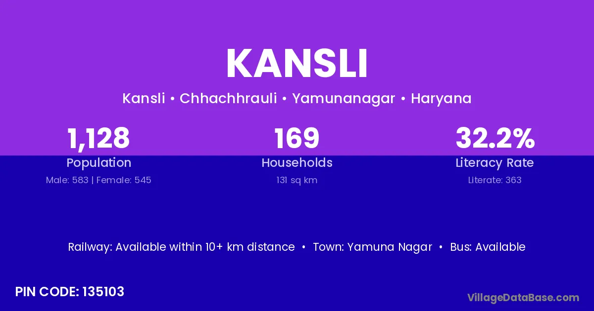 The literacy rate of Kansli village is 73.90%. Male literacy stands at 82.18% and female literacy at 64.84%.