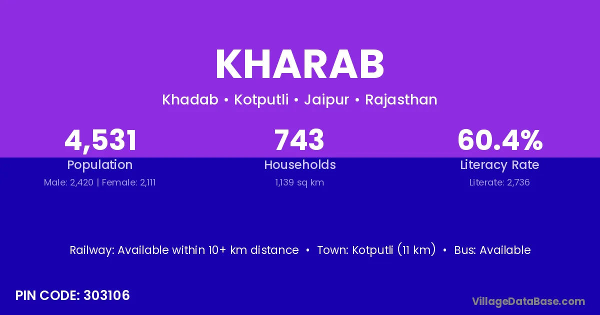 Kotputli (11 km) is the nearest town to Kharab village for major economic activities and is located approximately 11 km away.