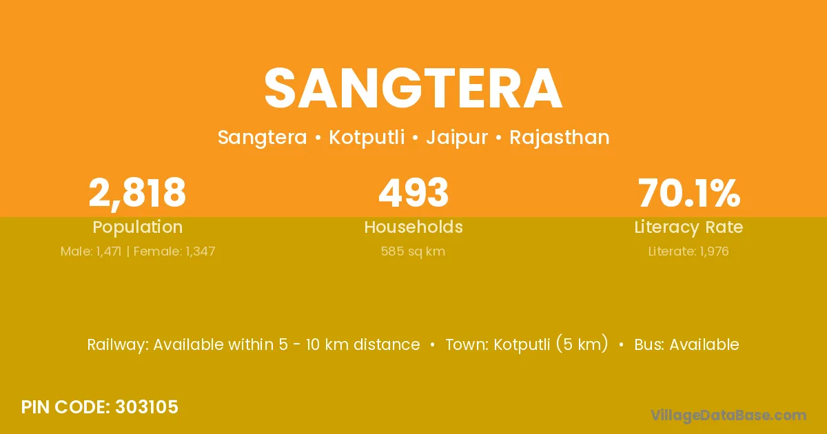Kotputli (5 km) is the nearest town to Sangtera village for major economic activities and is located approximately 5 km away.