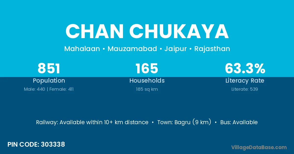 Bagru (9 km) is the nearest town to Chan Chukaya village for major economic activities and is located approximately 9 km away.