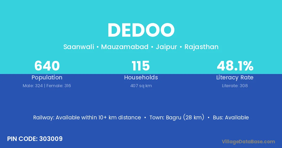 Bagru (28 km) is the nearest town to Dedoo village for major economic activities and is located approximately 28 km away.