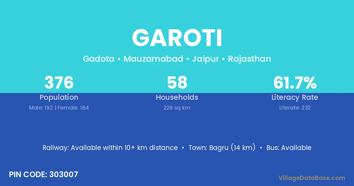 Bagru (14 km) is the nearest town to Garoti village for major economic activities and is located approximately 14 km away.