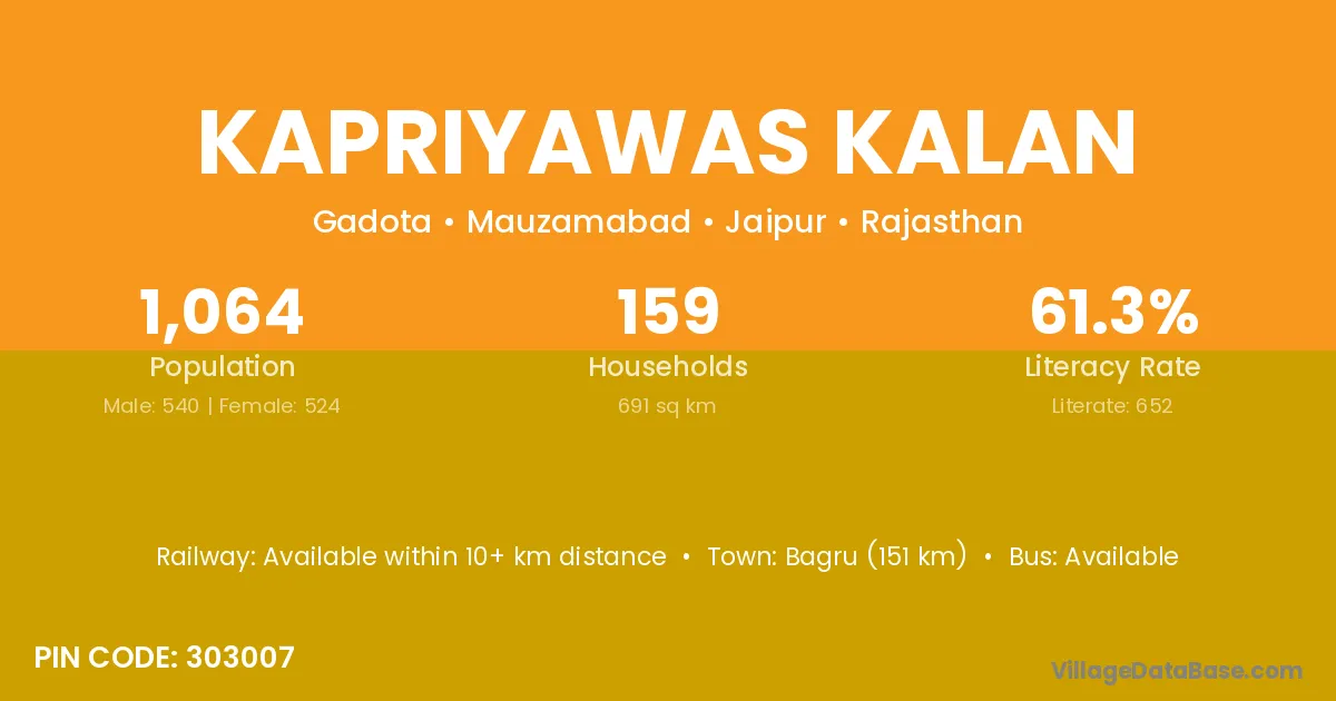 Bagru (151 km) is the nearest town to Kapriyawas Kalan village for major economic activities and is located approximately 151 km away.