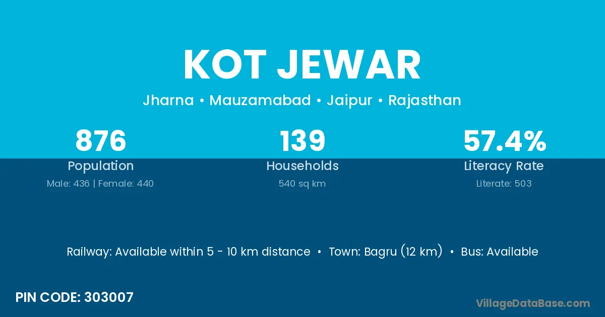Bagru (12 km) is the nearest town to Kot Jewar village for major economic activities and is located approximately 12 km away.