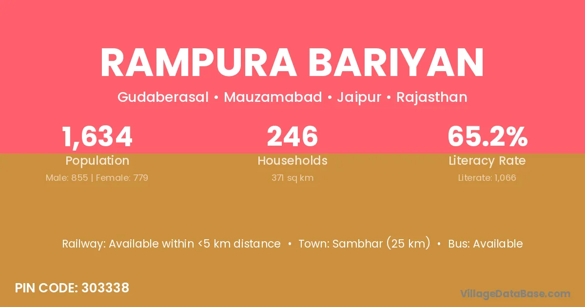 Sambhar (25 km) is the nearest town to Rampura Bariyan village for major economic activities and is located approximately 25 km away.