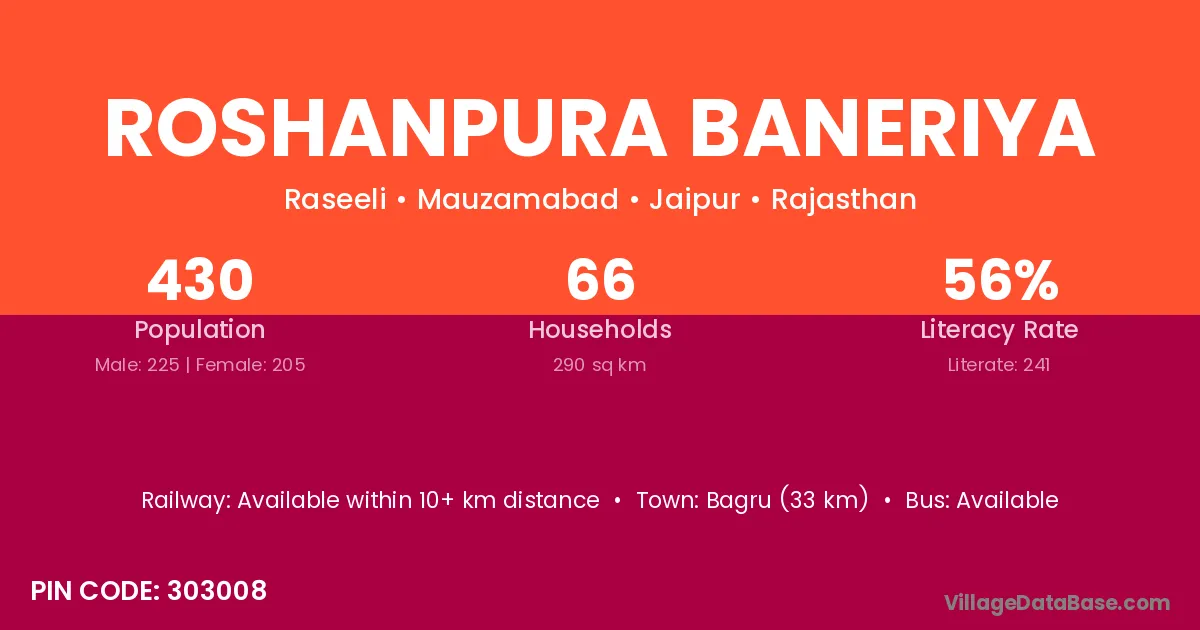 According to Census 2011 information, the village code of Roshanpura Baneriya village is 303008.