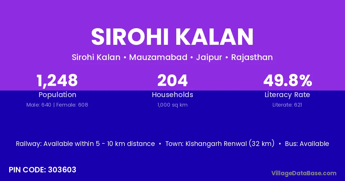 Sirohi Kalan village has a total population of 1,248 people, of which 640 are males and 608 are females.