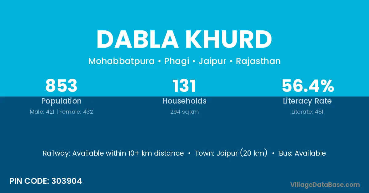 Jaipur (20 km) is the nearest town to Dabla Khurd village for major economic activities and is located approximately 20 km away.