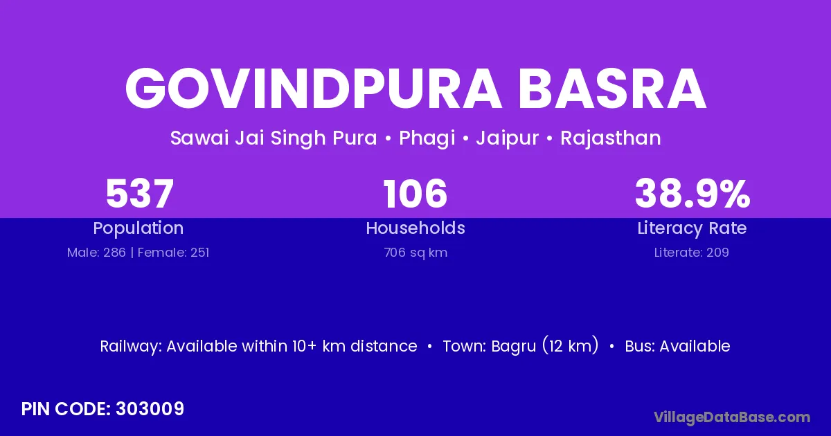 Bagru (12 km) is the nearest town to Govindpura Basra village for major economic activities and is located approximately 12 km away.