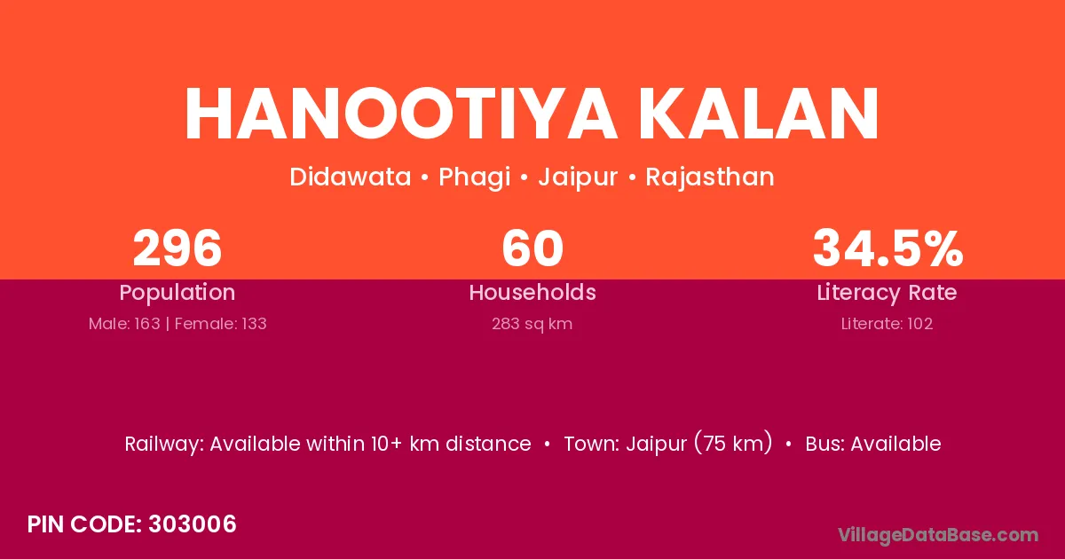 Jaipur (75 km) is the nearest town to Hanootiya Kalan village for major economic activities and is located approximately 75 km away.