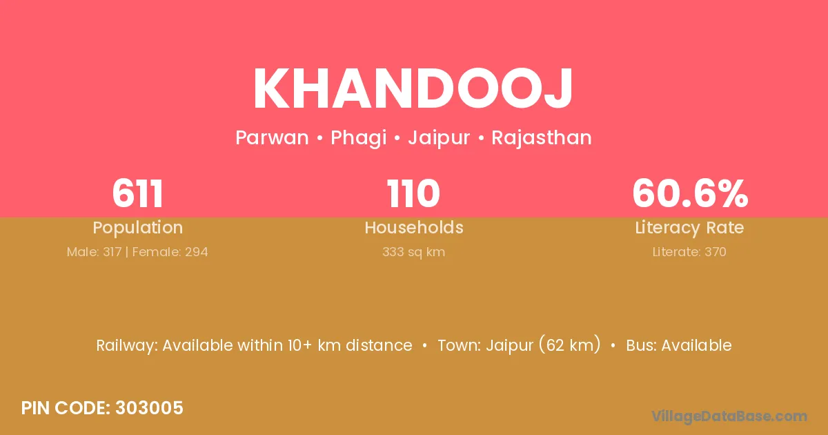 Khandooj village has a total population of 611 people, of which 317 are males and 294 are females.