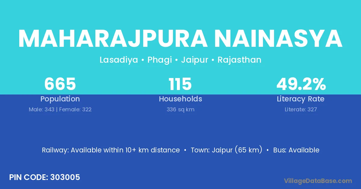 Jaipur (65 km) is the nearest town to Maharajpura Nainasya village for major economic activities and is located approximately 65 km away.