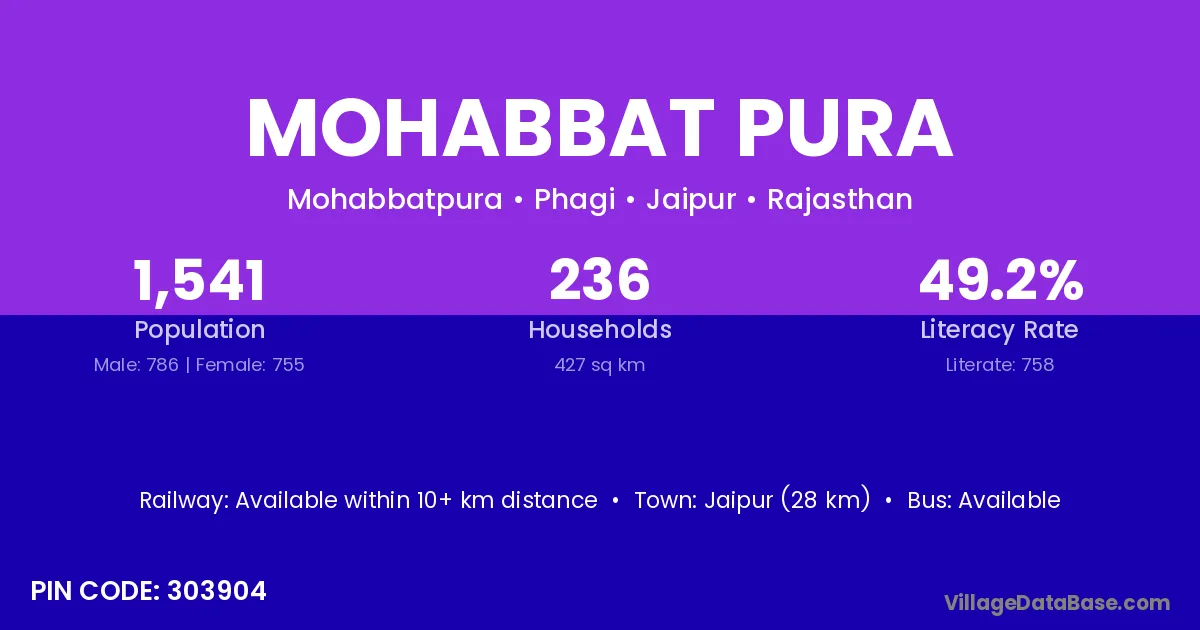 Jaipur (28 km) is the nearest town to Mohabbat Pura village for major economic activities and is located approximately 28 km away.