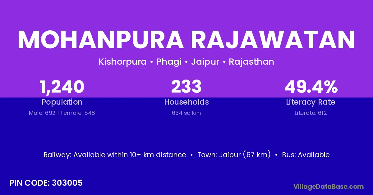 Mohanpura Rajawatan village has a total population of 1,240 people, of which 692 are males and 548 are females.
