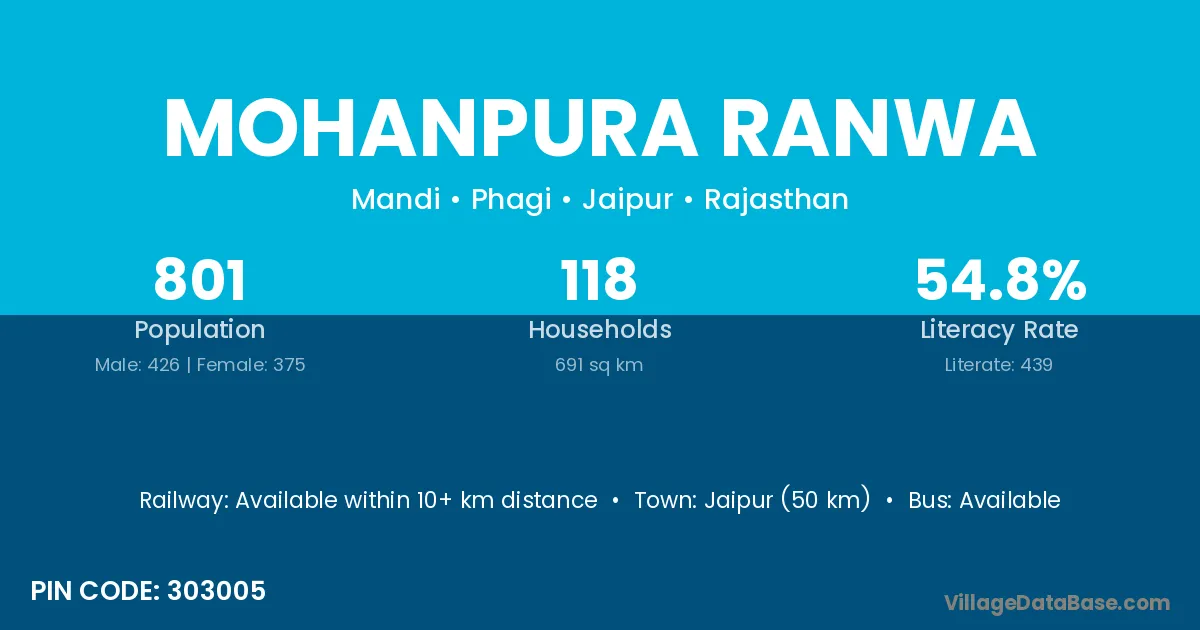Jaipur (50 km) is the nearest town to Mohanpura Ranwa village for major economic activities and is located approximately 50 km away.