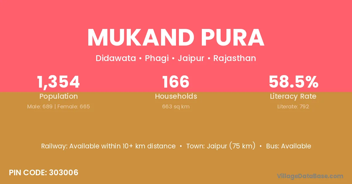 Jaipur (75 km) is the nearest town to Mukand Pura village for major economic activities and is located approximately 75 km away.
