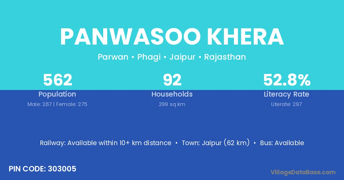 Jaipur (62 km) is the nearest town to Panwasoo Khera village for major economic activities and is located approximately 62 km away.