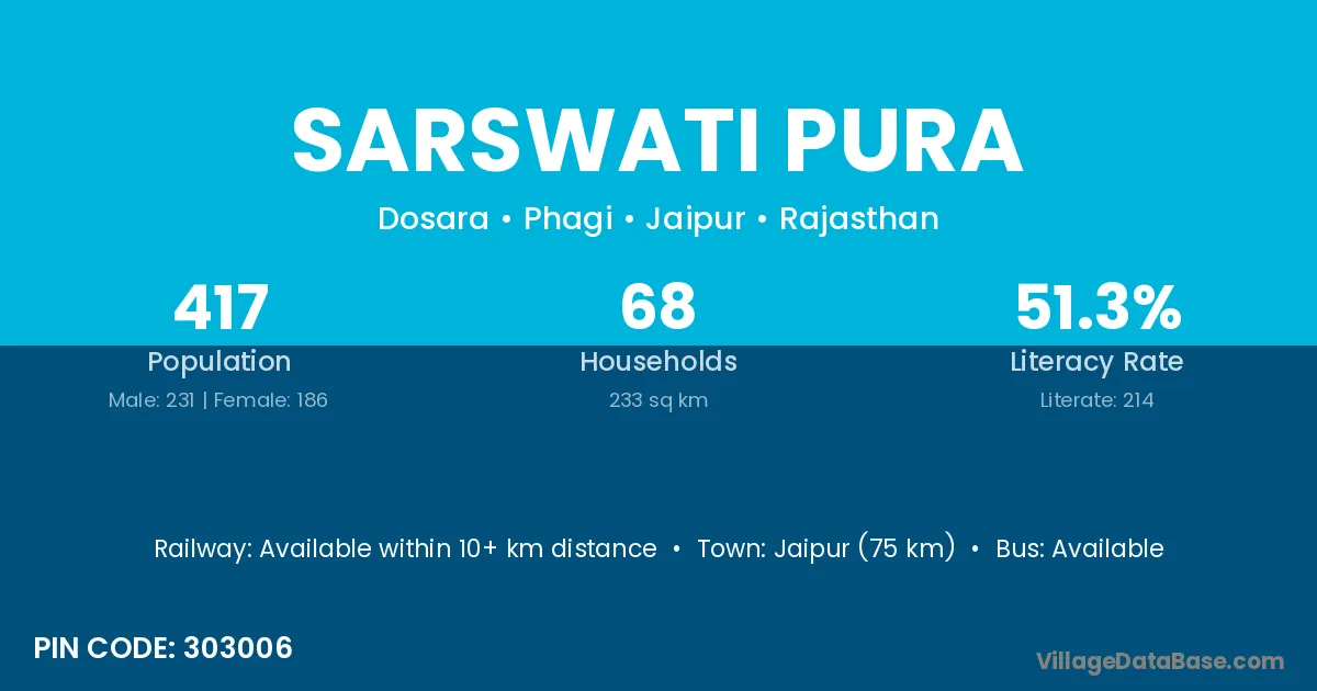 Sarswati Pura village has a total population of 417 people, of which 231 are males and 186 are females.