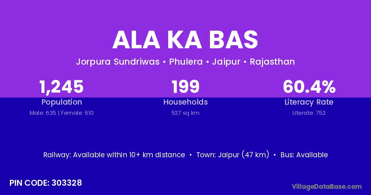 Jaipur (47 km) is the nearest town to Ala Ka Bas village for major economic activities and is located approximately 47 km away.