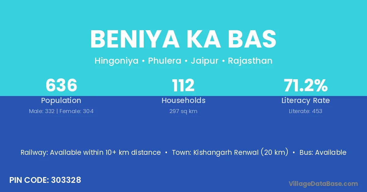 Kishangarh Renwal (20 km) is the nearest town to Beniya Ka Bas village for major economic activities and is located approximately 20 km away.