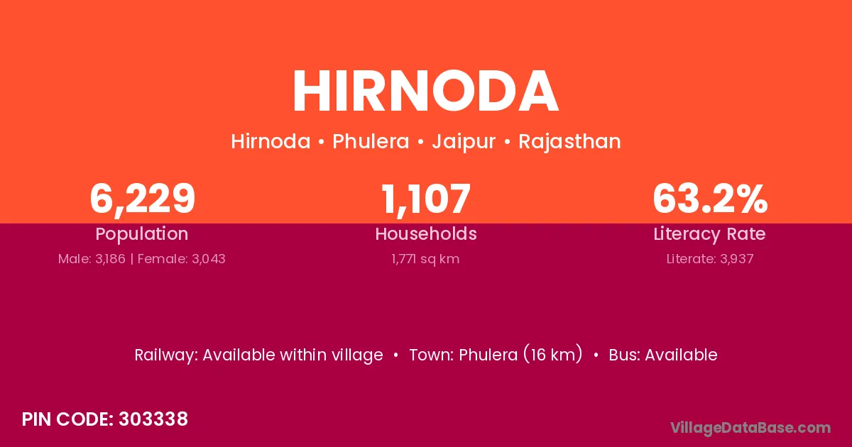 Phulera (16 km) is the nearest town to Hirnoda village for major economic activities and is located approximately 16 km away.