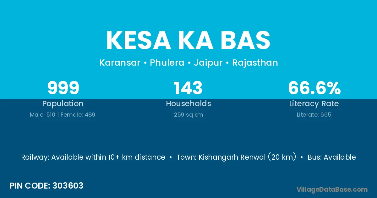 Kishangarh Renwal (20 km) is the nearest town to Kesa Ka Bas village for major economic activities and is located approximately 20 km away.