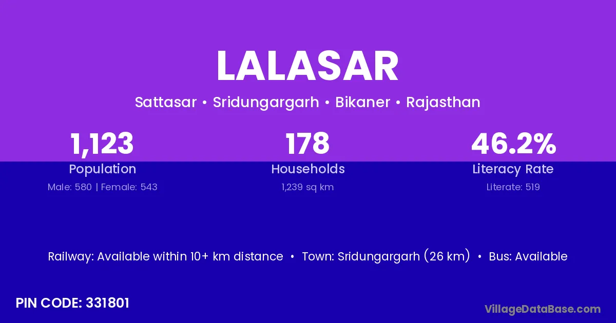 According to Census 2011 information, the village code of Lalasar village is 303603.