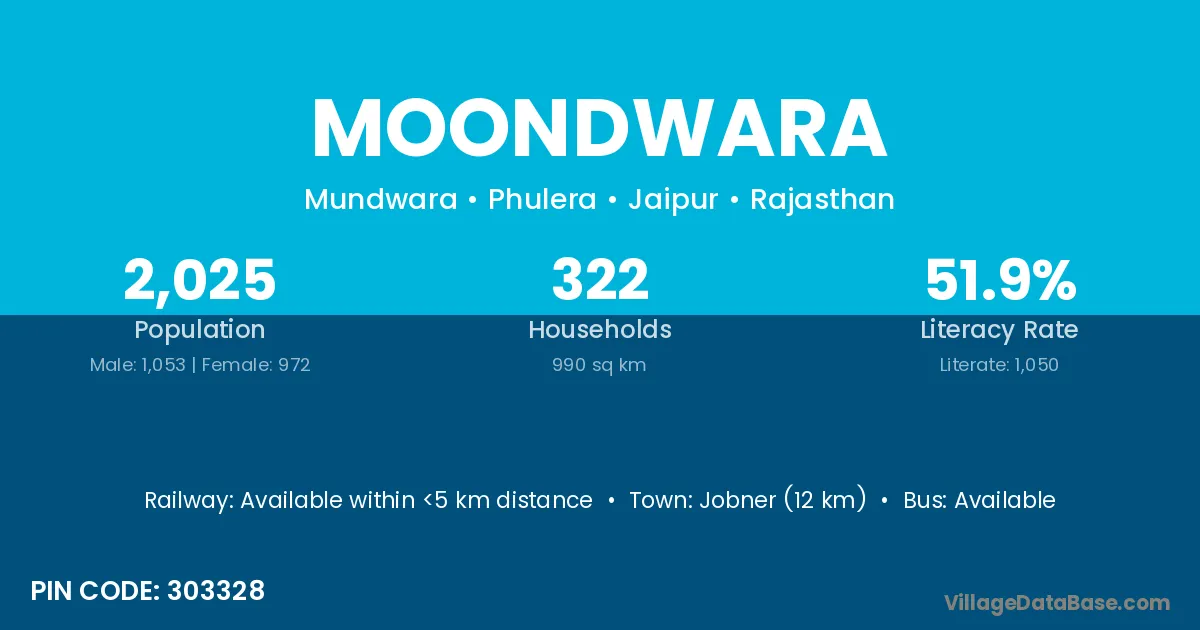Jobner (12 km) is the nearest town to Moondwara village for major economic activities and is located approximately 12 km away.