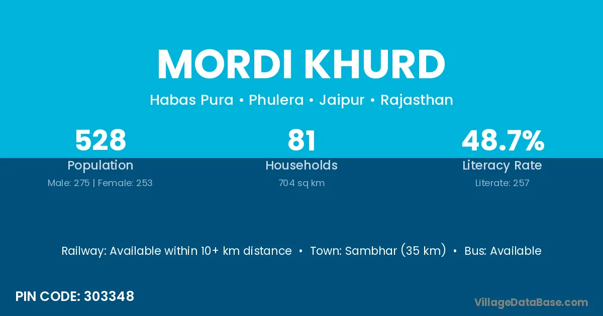 Sambhar (35 km) is the nearest town to Mordi Khurd village for major economic activities and is located approximately 35 km away.