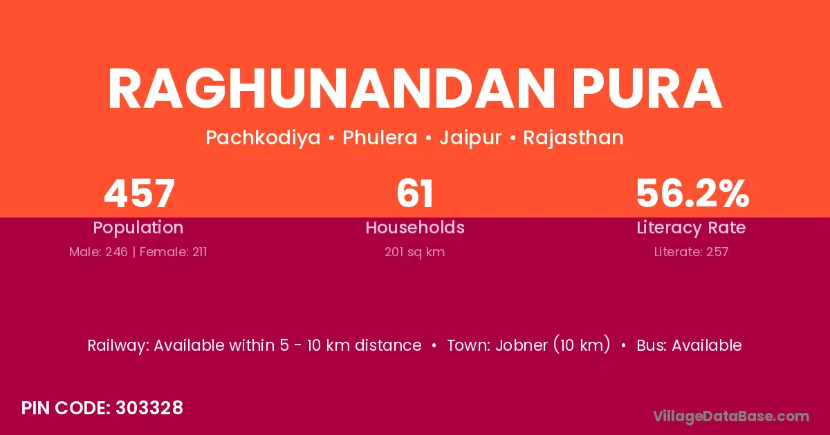 Jobner (10 km) is the nearest town to Raghunandan Pura village for major economic activities and is located approximately 10 km away.