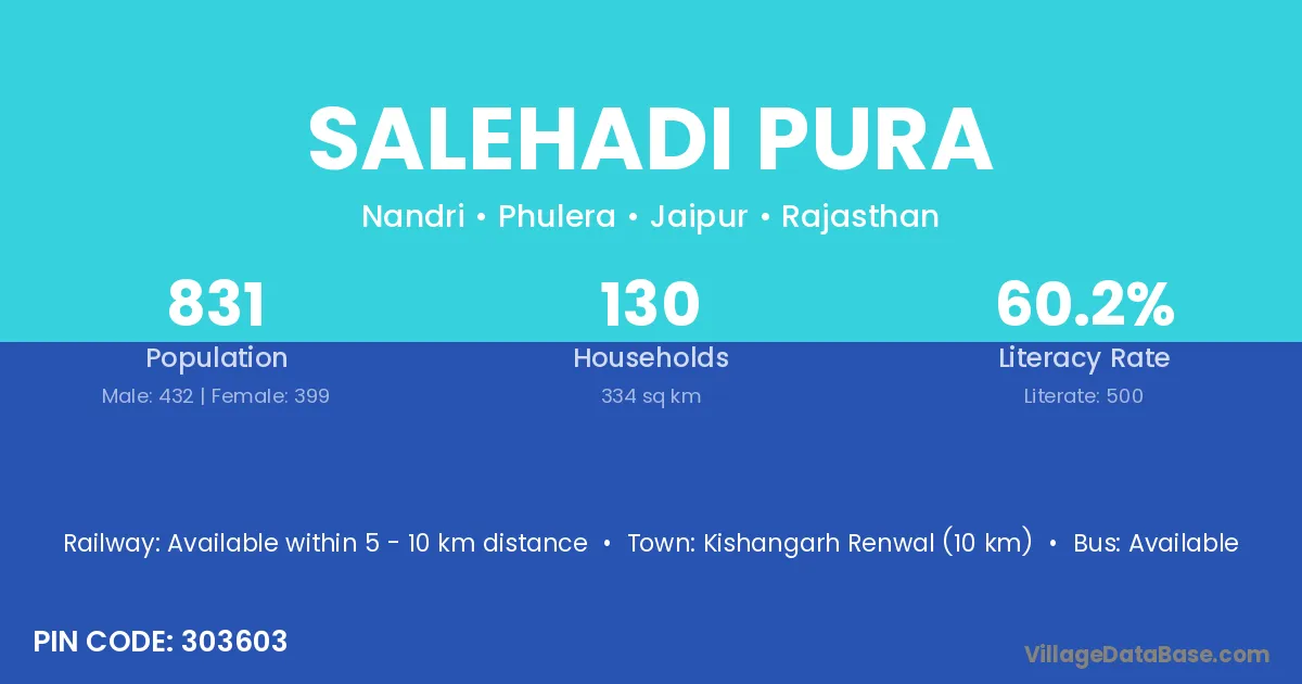 Kishangarh Renwal (10 km) is the nearest town to Salehadi Pura village for major economic activities and is located approximately 10 km away.