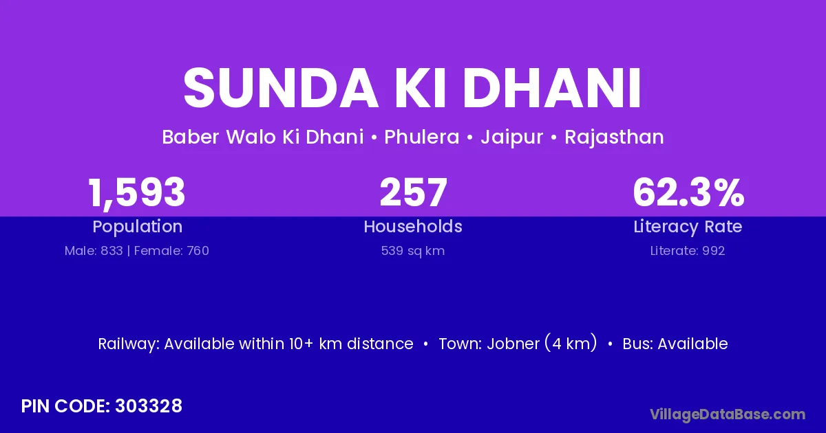 Sunda Ki Dhani village has a total population of 1,593 people, of which 833 are males and 760 are females.