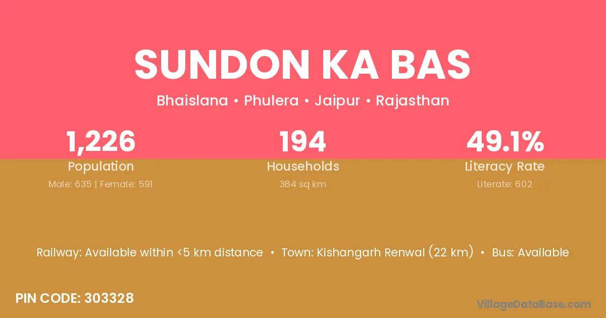 Sundon Ka Bas village has a total population of 1,226 people, of which 635 are males and 591 are females.