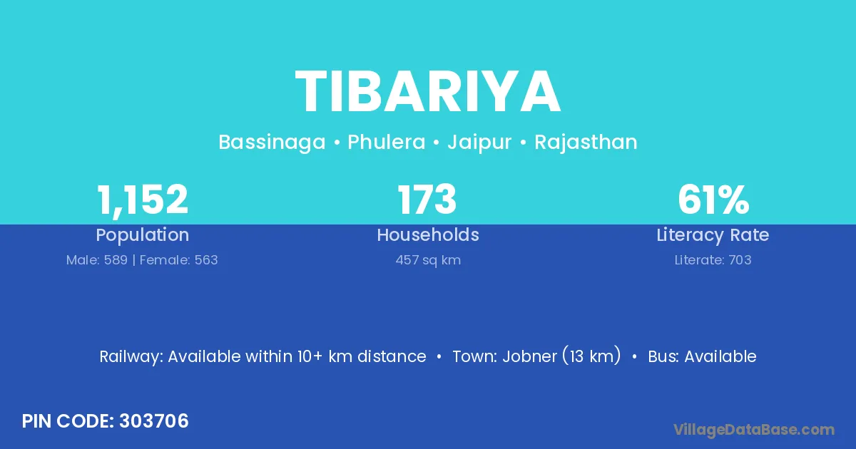 Jobner (13 km) is the nearest town to Tibariya village for major economic activities and is located approximately 13 km away.