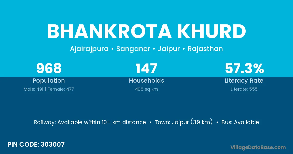Bhankrota Khurd village has a total population of 968 people, of which 491 are males and 477 are females.