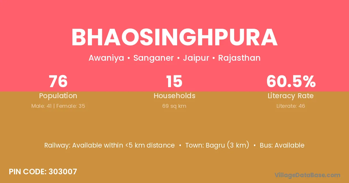 Bagru (3 km) is the nearest town to Bhaosinghpura village for major economic activities and is located approximately 3 km away.