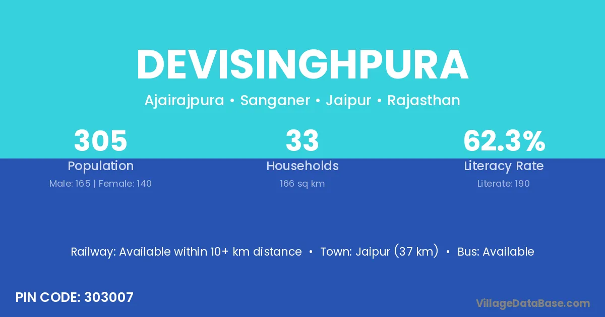 Jaipur (37 km) is the nearest town to Devisinghpura village for major economic activities and is located approximately 37 km away.