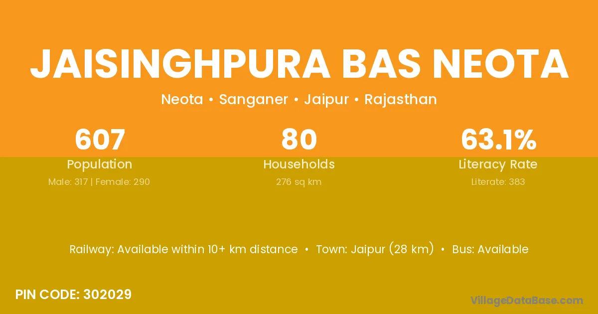 Jaisinghpura Bas Neota village has a total population of 607 people, of which 317 are males and 290 are females.