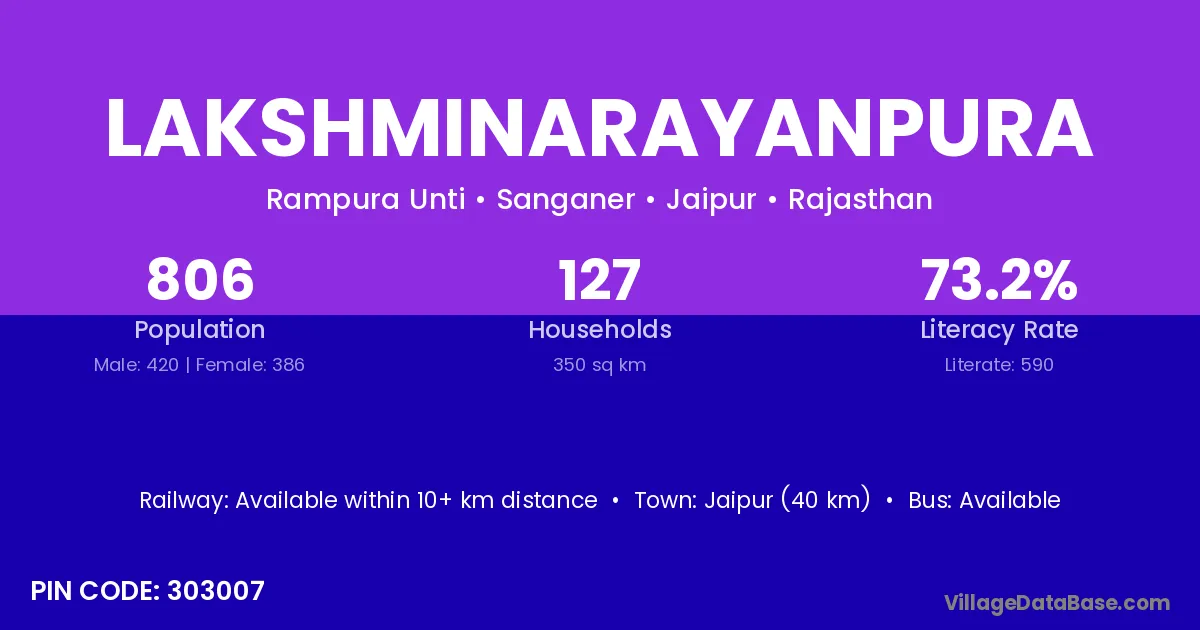 Lakshminarayanpura village has a total population of 806 people, of which 420 are males and 386 are females.