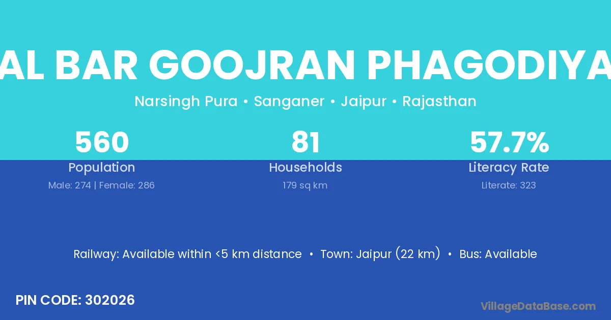 Jaipur (22 km) is the nearest town to Nangal Bar Goojran Phagodiyawala village for major economic activities and is located approximately 22 km away.