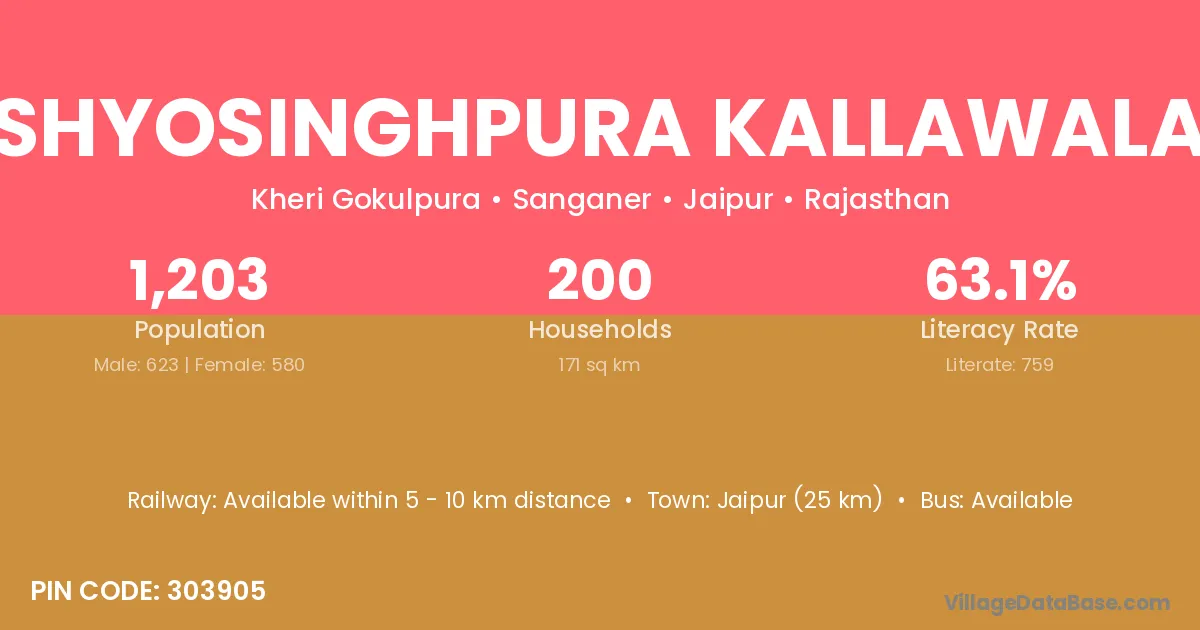 Shyosinghpura Kallawala village has a total population of 1,203 people, of which 623 are males and 580 are females.