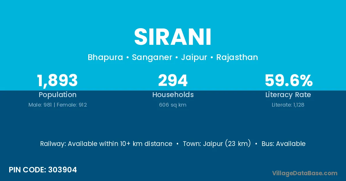 Jaipur (23 km) is the nearest town to Sirani village for major economic activities and is located approximately 23 km away.