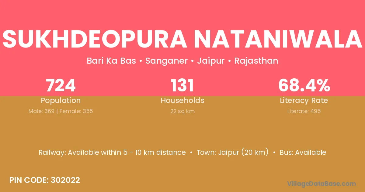 Jaipur (20 km) is the nearest town to Sukhdeopura Nataniwala village for major economic activities and is located approximately 20 km away.
