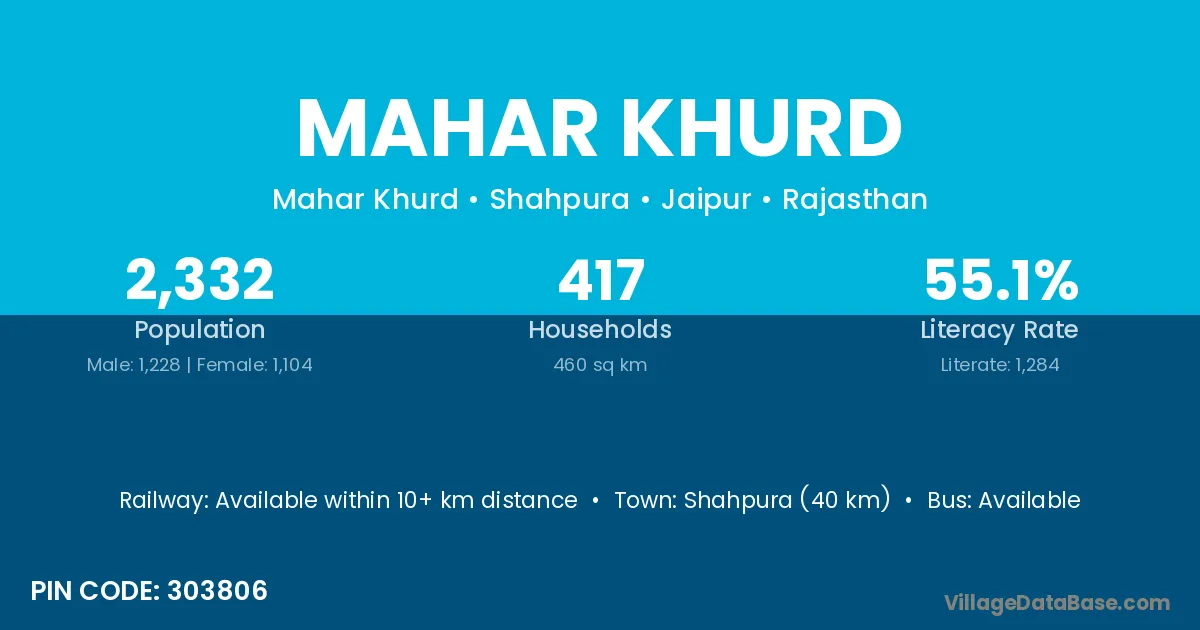 Shahpura (40 km) is the nearest town to Mahar Khurd village for major economic activities and is located approximately 40 km away.